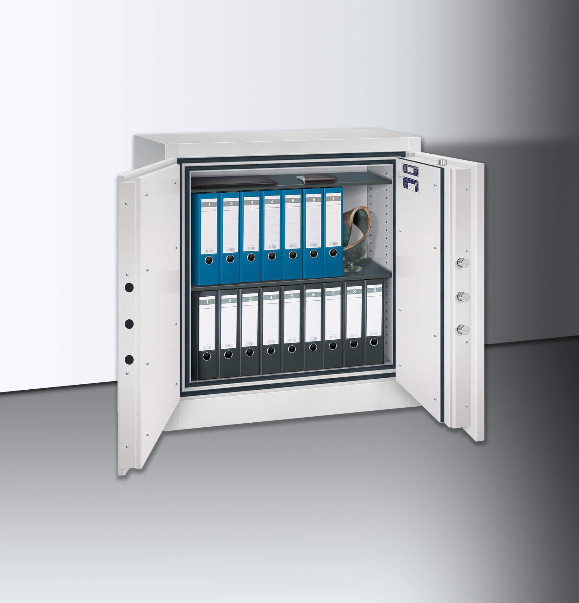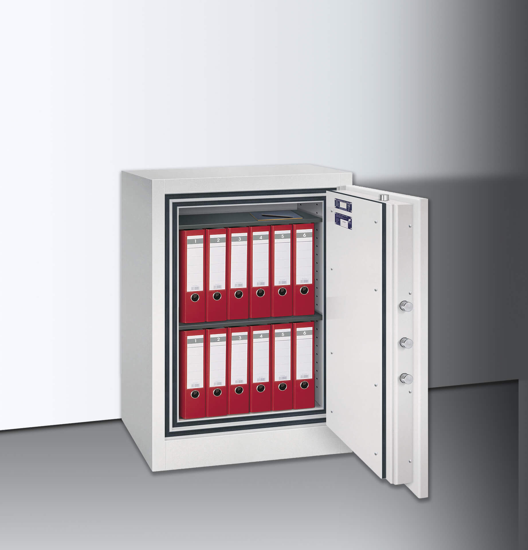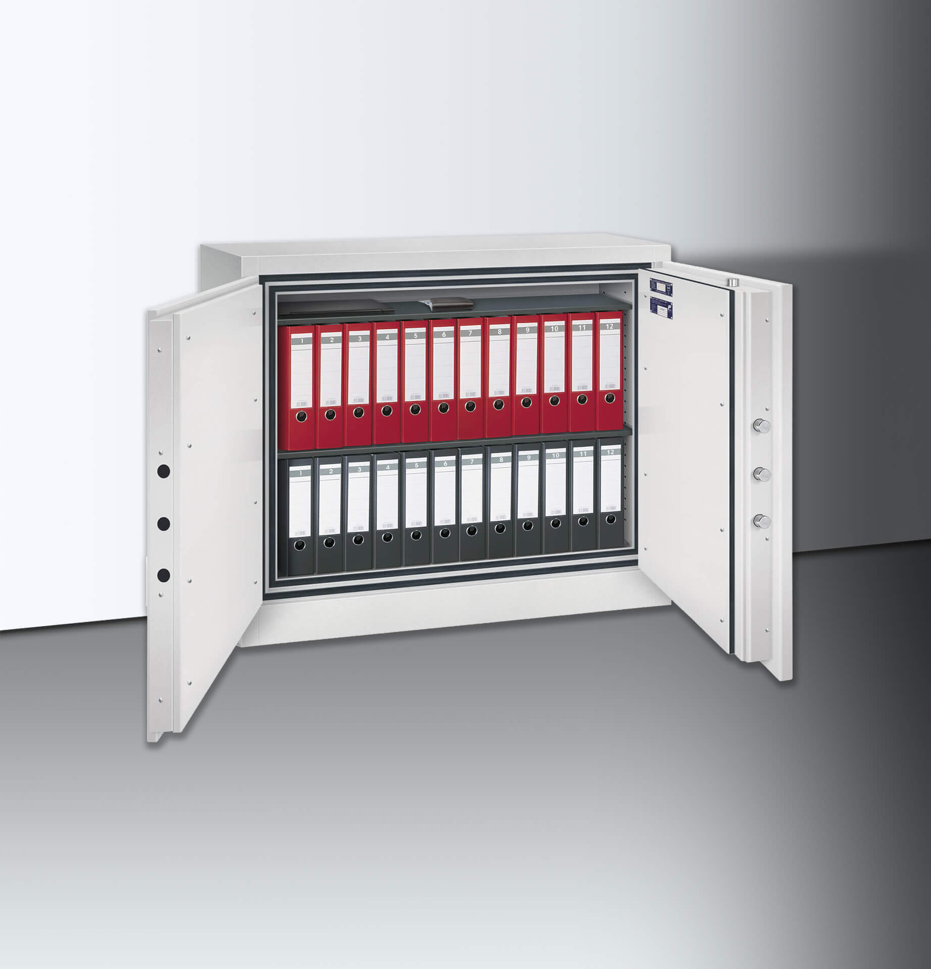 Die erhöhte Feuersicherheit sowie der zertifizierte Einbruchschutz mit dem Sicherheitsgrad 2 bewahren Ihre Unterlagen deutlich sicherer als die Basisserie.