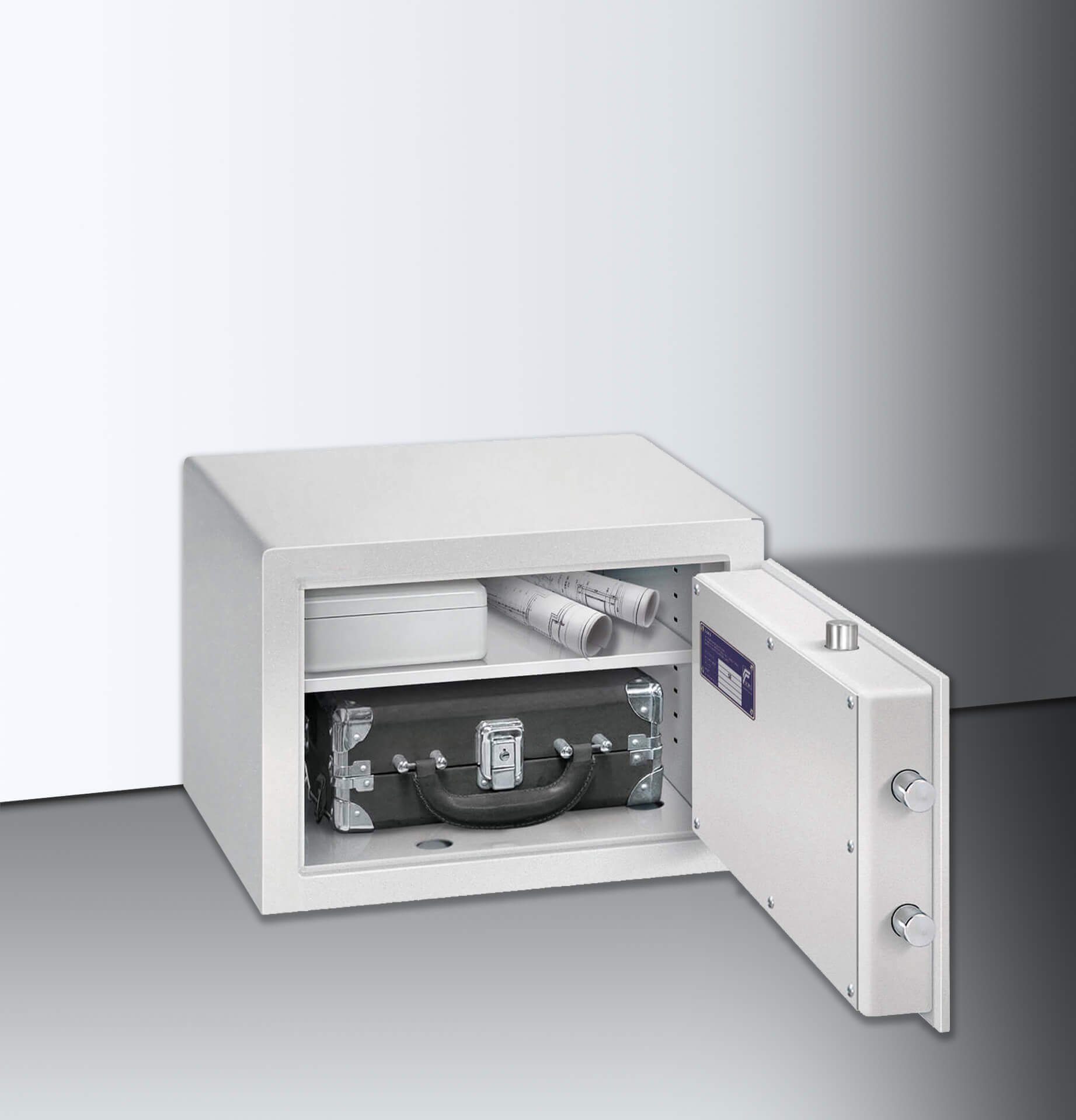 - Wahlweise mit Doppelbart-Sicherheitsschloss inklusive 2 Schlüssel oder einem nach EN 1300 zertifizierten mechanischen Zahlenkombinationsschloss ausgestattet