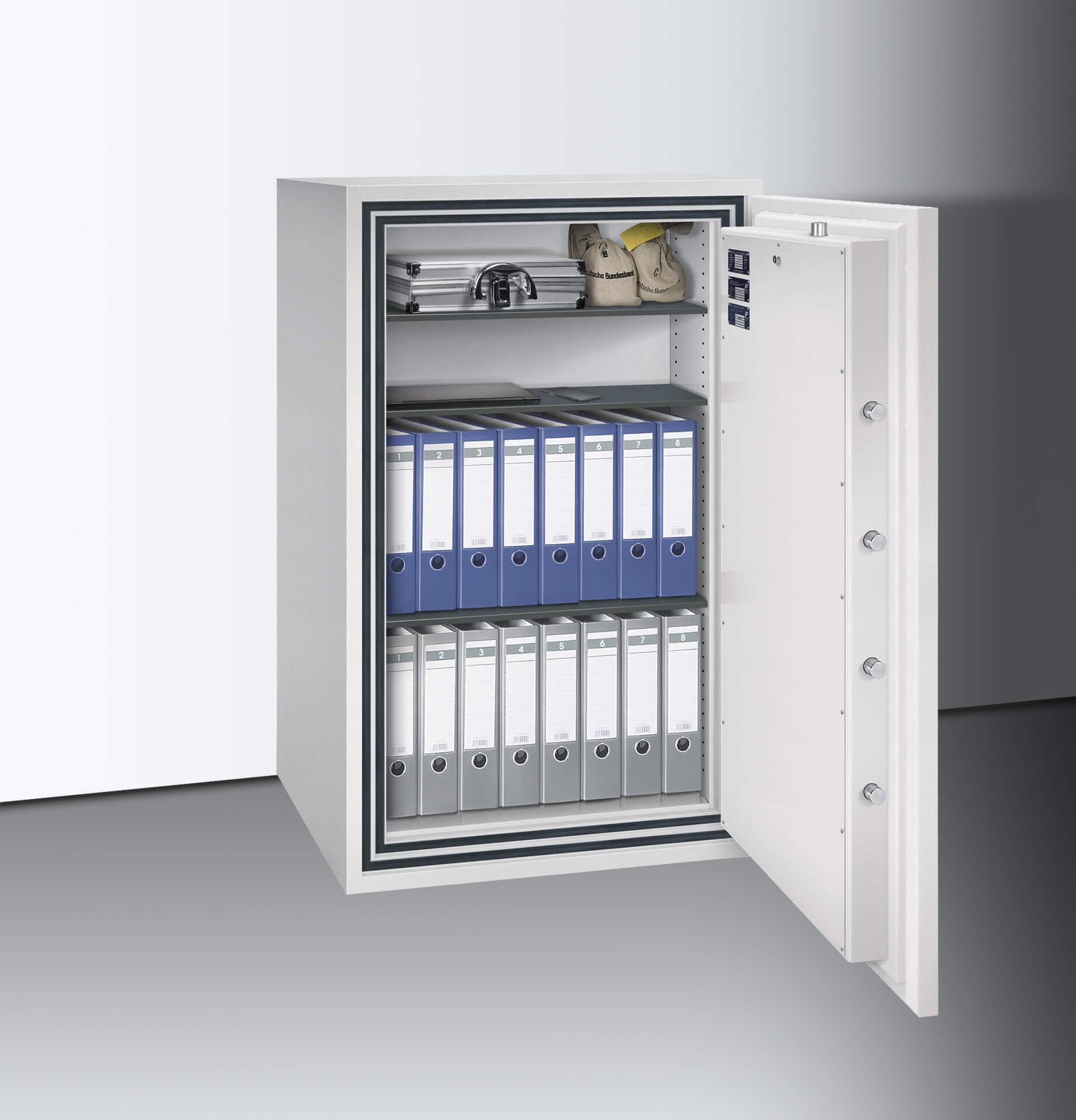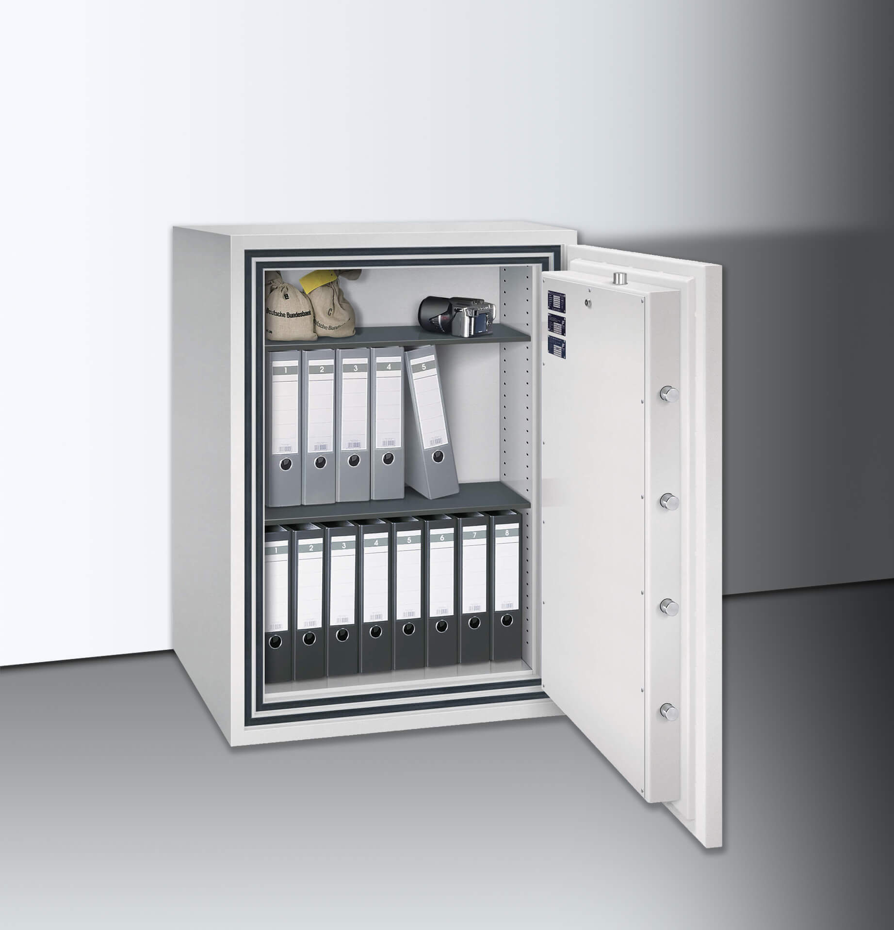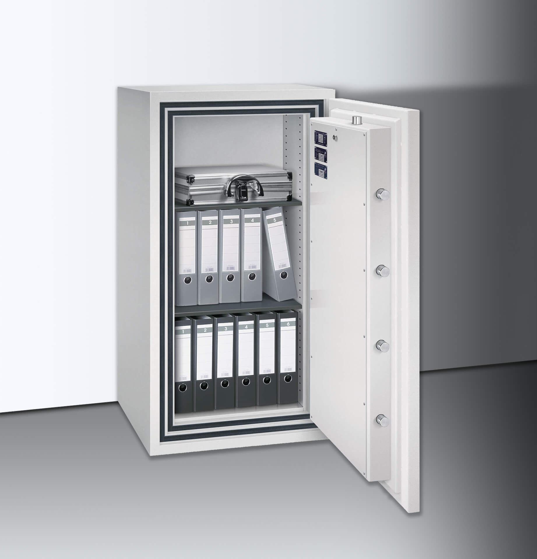 Der Verschlussbereich ist gegen Aufbohrversuche mit einer Manganpanzerung geschützt, zudem sind Zusatzsicherungen an den Sperrpunkten angebracht. Serienmäßig vorbereitet sind eine Einbruchmeldeanlage sowie die Bodenverankerung (bis 1000 kg). Für 30 Minuten schützt der isolierende Spezialbeton den Inhalt vor Zerstörung durch starken Brand.