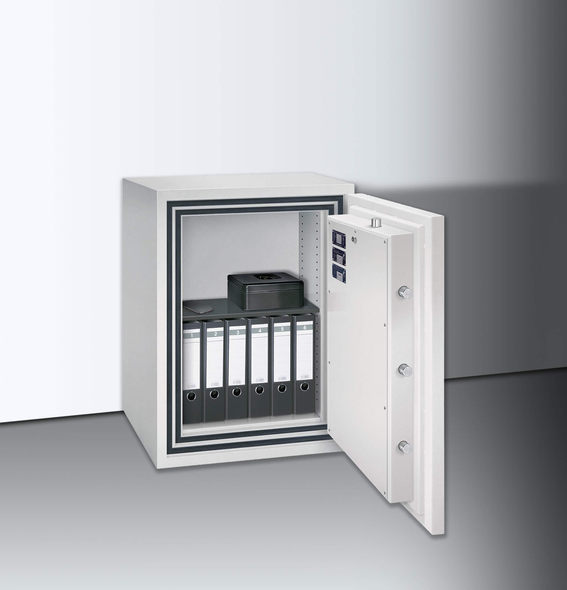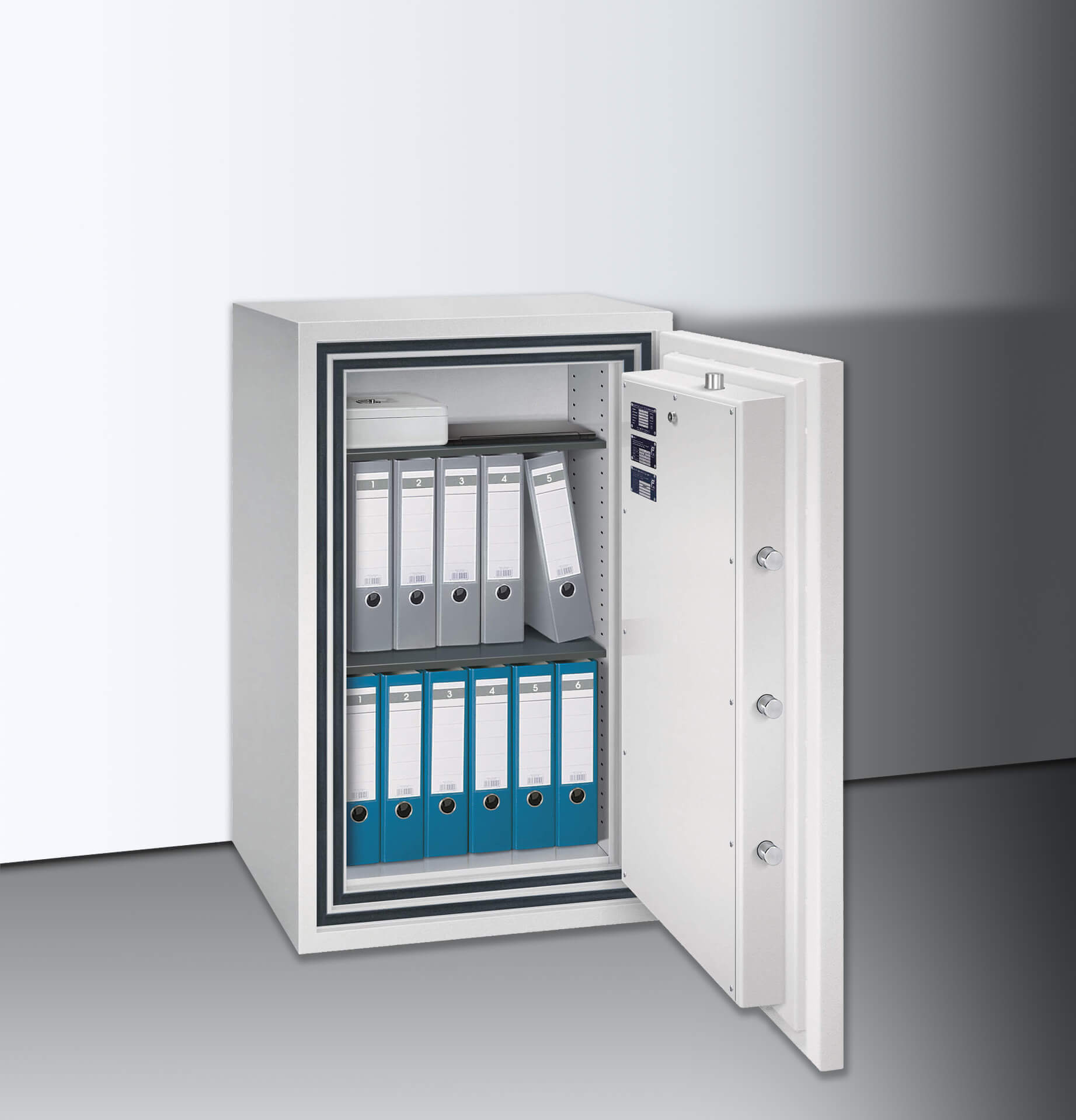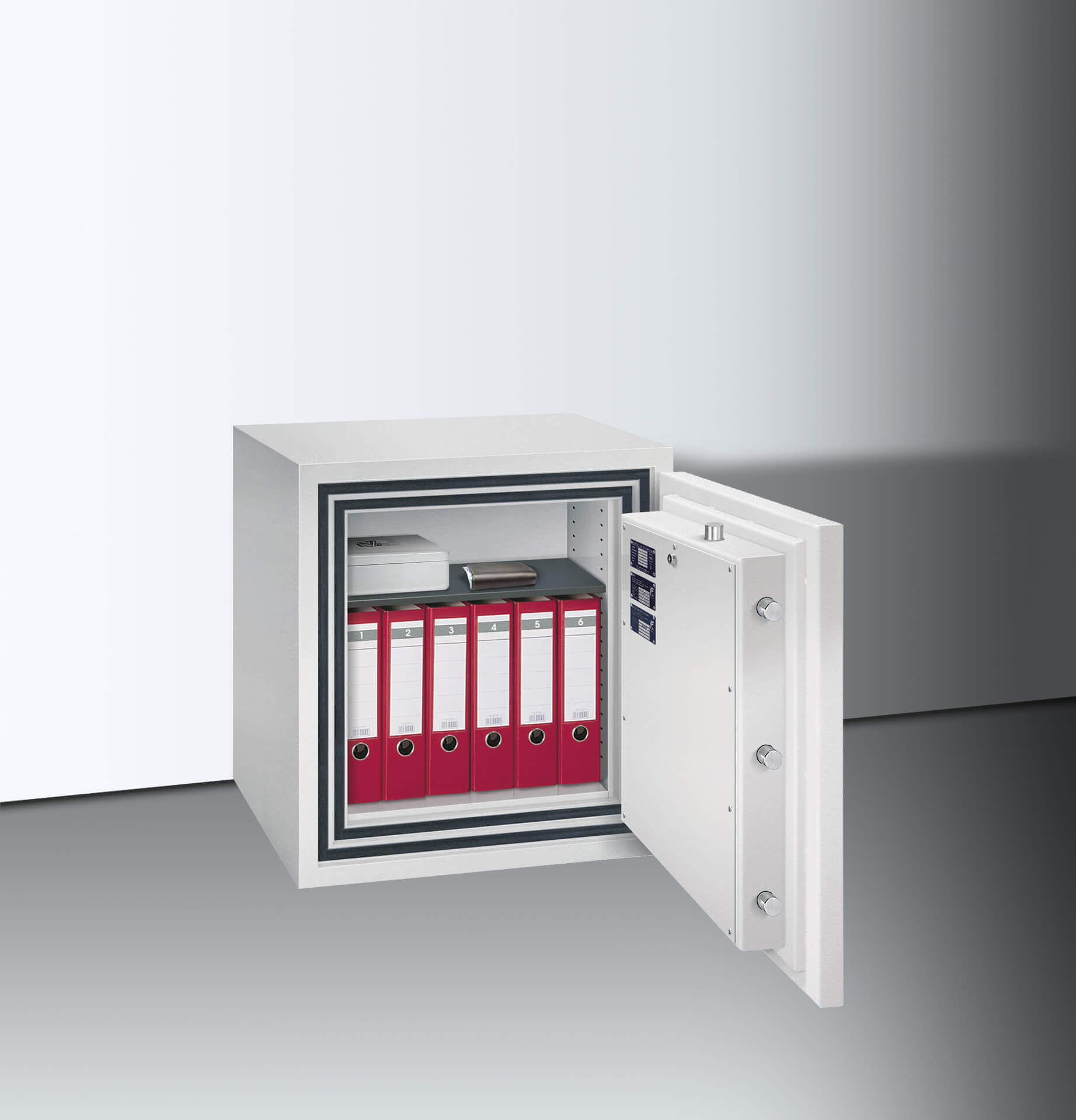 Der Verschlussbereich ist gegen Aufbohrversuche mit einer Manganpanzerung geschützt, zudem sind Zusatzsicherungen an den Sperrpunkten angebracht. Serienmäßig vorbereitet sind eine Einbruchmeldeanlage sowie die Bodenverankerung (bis 1000 kg). Für 30 Minuten schützt der isolierende Spezialbeton den Inhalt vor Zerstörung durch starken Brand.