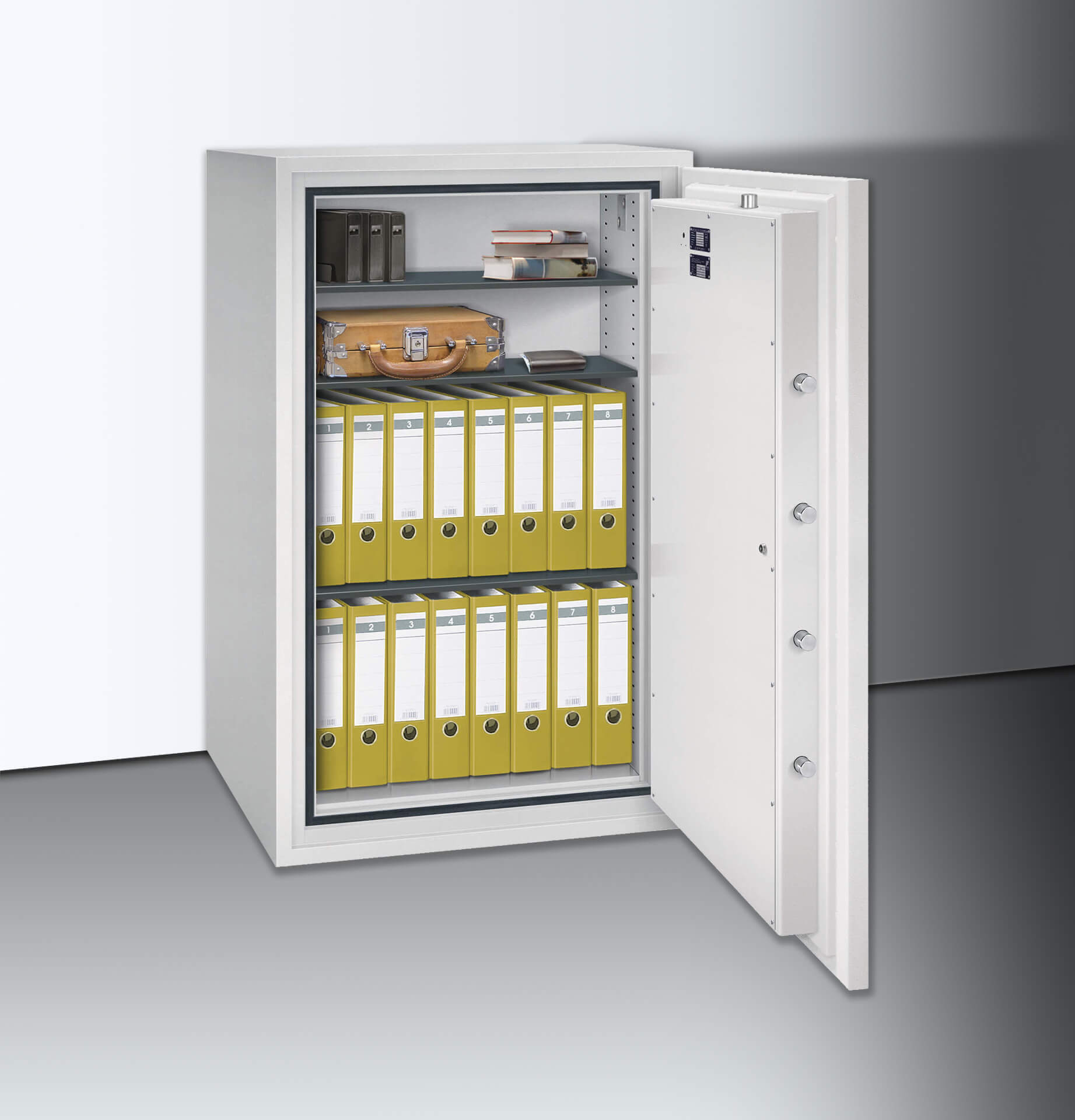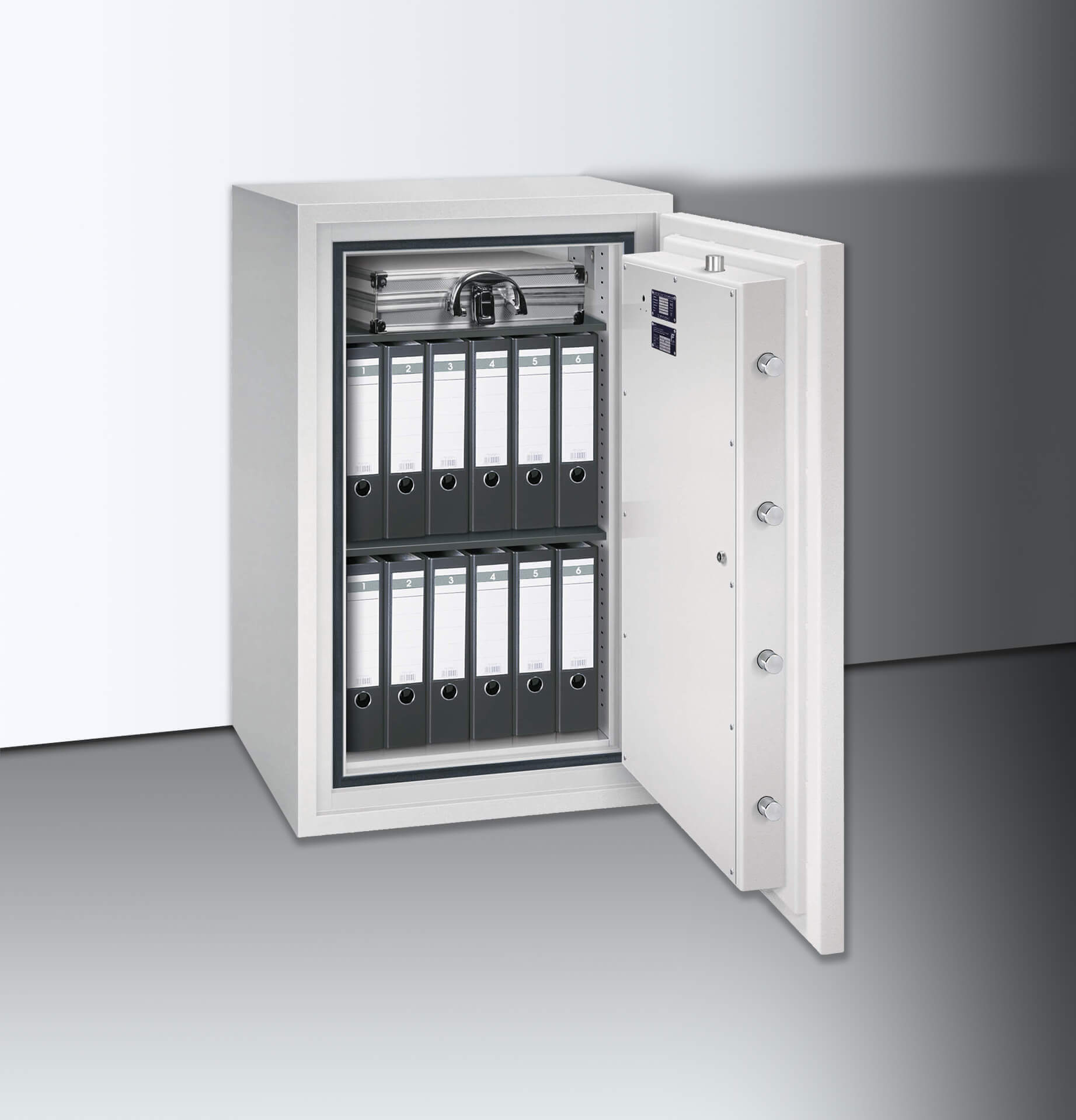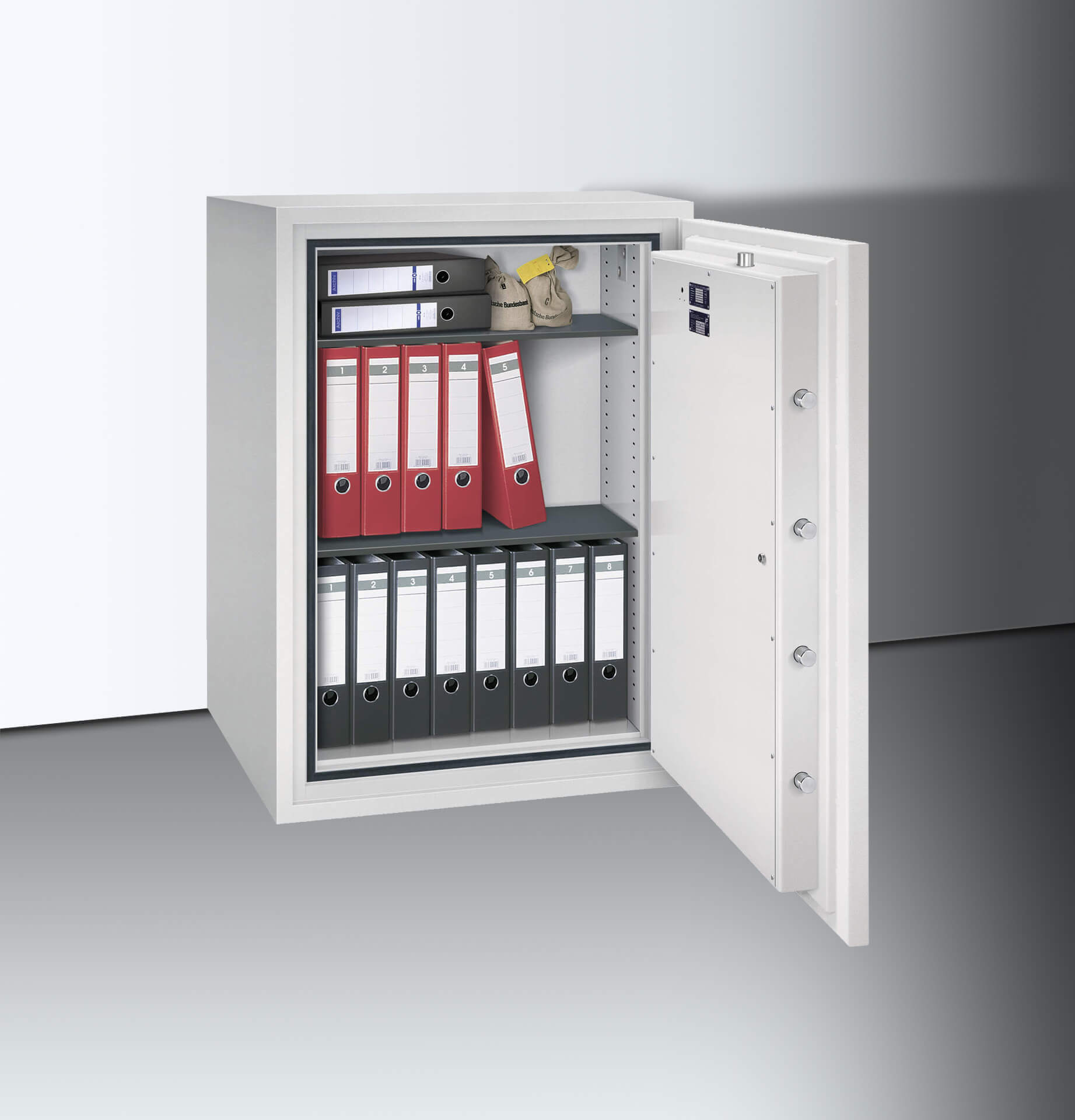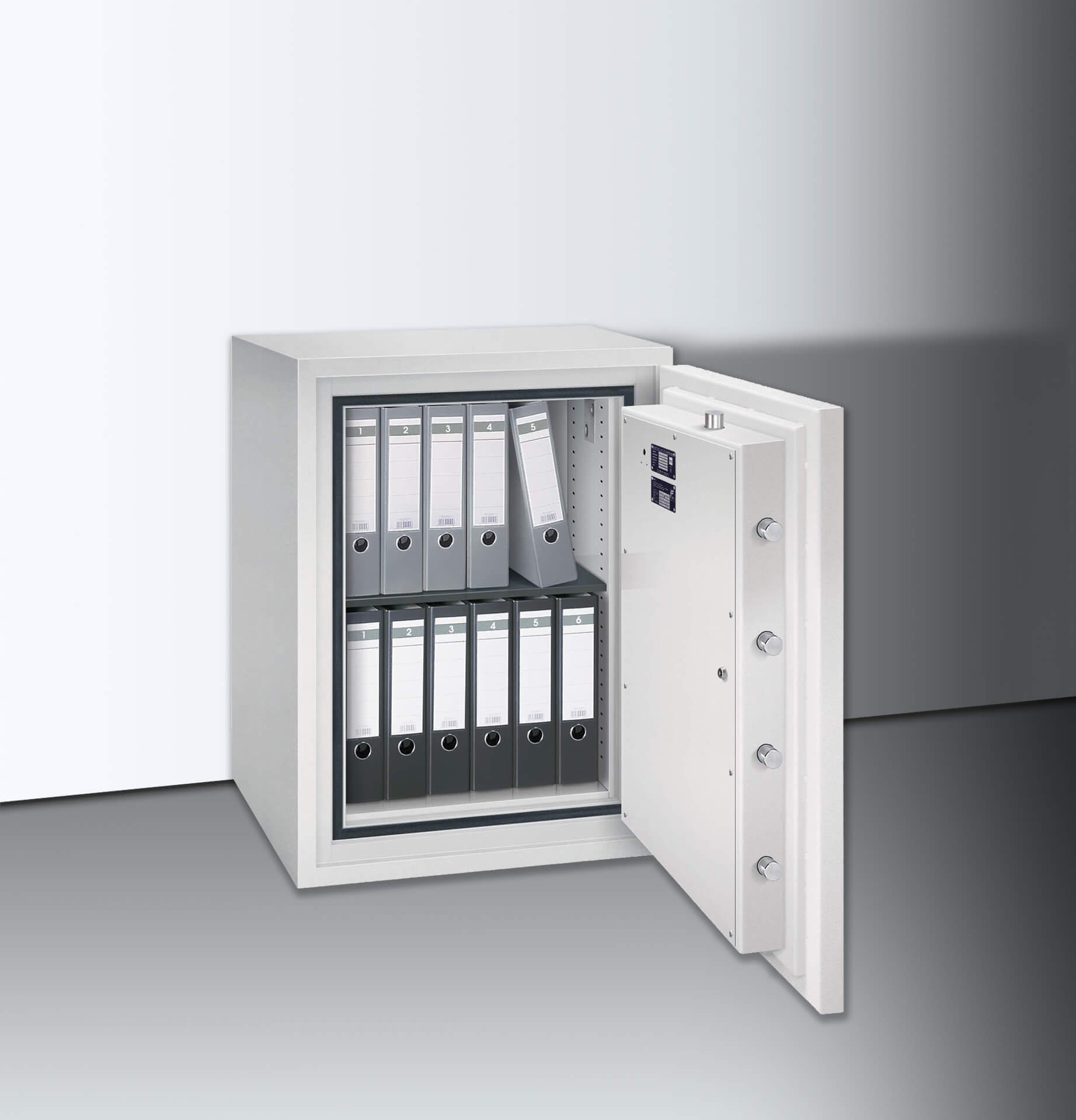 Der Übergang zur Tür ist an drei Seiten mit insgesamt sieben Stahlriegelbolzen gesichert, an der vierten Seite verhindert eine Hintergreiferschiene das Aufhebeln der Tür. Der Verschlussbereich ist zusätzlich gepanzert. Wir liefern die Tresore mit einem säurebeständigem Doppelbartschloss aus. Dieses können Sie optional gegen einen individuellen Zugangsmechanismus tauschen. Weiterhin können Sie die vormontierten Anschlüsse für externe Überwachungstechnik wie Körperschallmelder oder einer Alarmanlage und die Bodenverankerung gegen Diebstahl des gesamten Tresores nutzen.