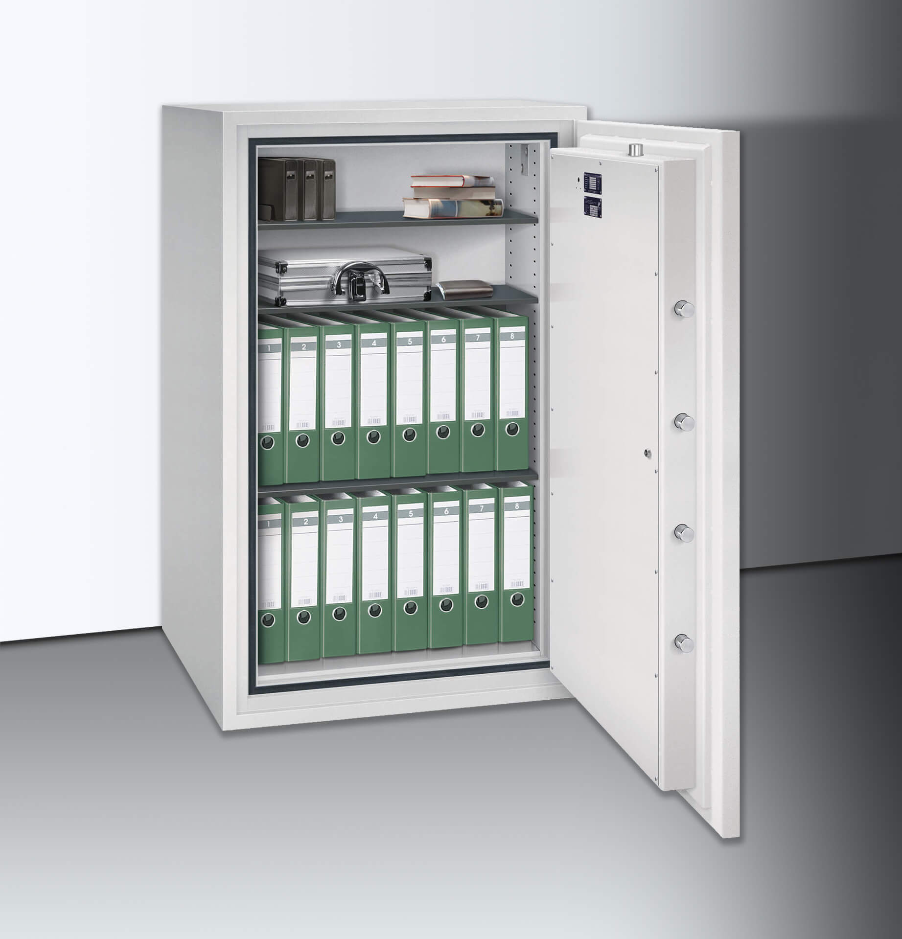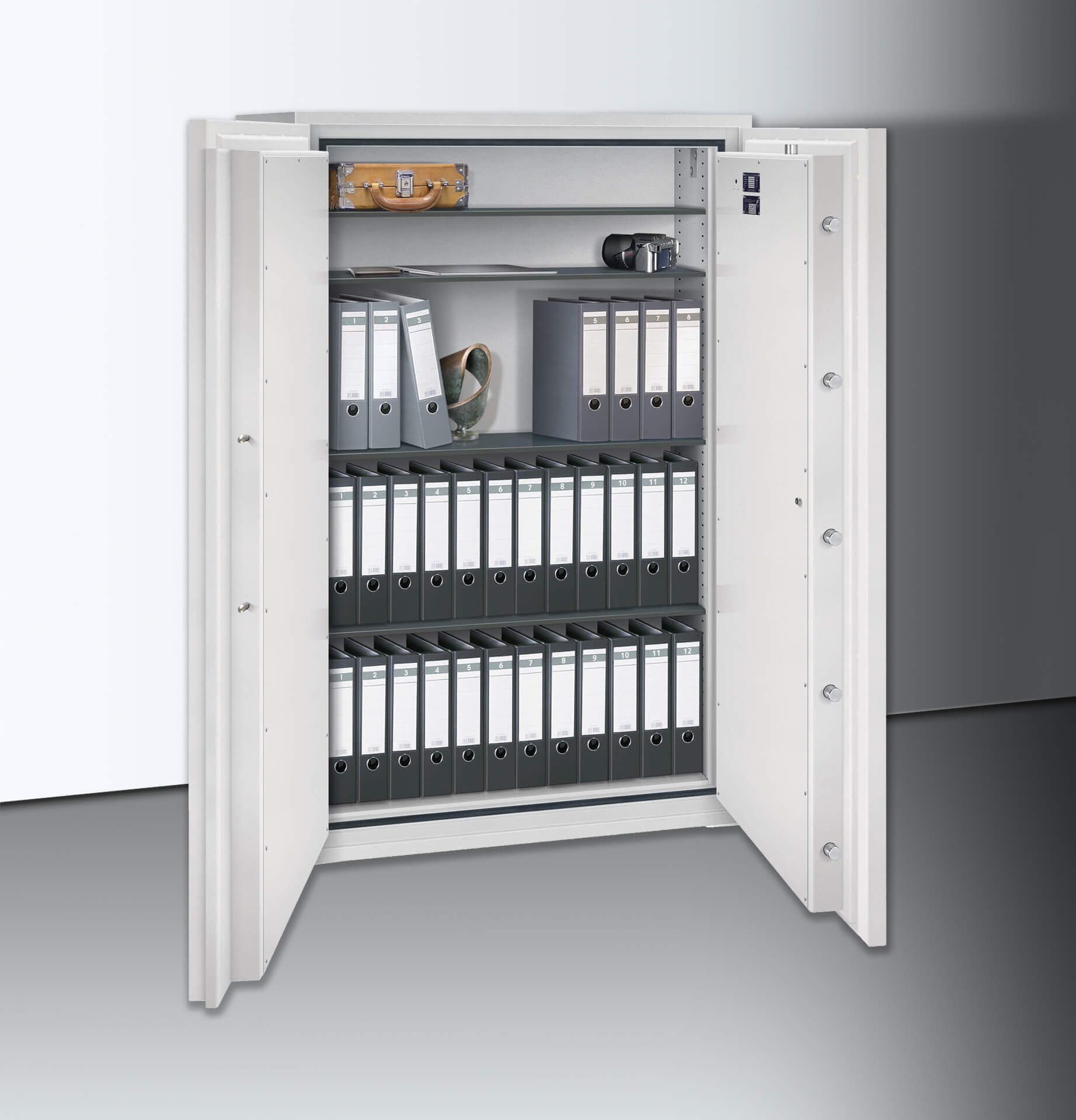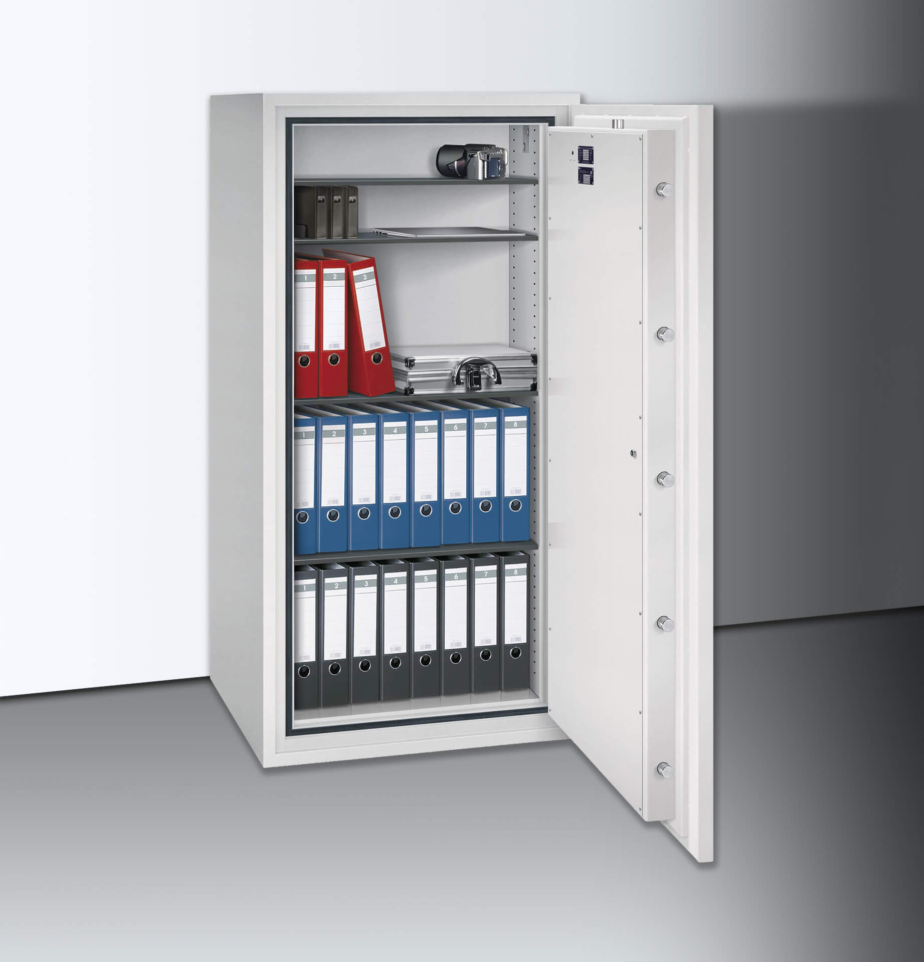 Hohe Sicherheit: Die S-V-Serie ist ein hervorragender Schutz für hohe Werte. Der dreiwandige Tresoraufbau, gefüllt mit Spezialbeton, hat eine zusätzliche Panzerung gegen Schweiß- und Schneidbrennerangriffe im Verschlussbereich. Der Übergang von der Tür zum Korpus bilden sechs 40 mm starke Riegelbolzen aus Stahl, massive Hintergreiferbolzen verhindern ein Aufhebeln der Tür auch bei durchtrennten Scharnierbändern. Sicherungen gegen Aufbohren an allen Sperrpunkten und ein Notverriegelungsmechanismus sichern den Inhalt zusätzlich ab. Die Wertschutzschränke dieser Klasse verfügen über zwei Doppelbartsicherheitsschlösser, welche natürlich durch eine unserer vielen Varianten optional ersetzt werden kann. Um die Sicherheit zu erhöhen, können Sie die installierten Vorbereitungen für eine externe Überwachung und Einbruchmeldeanlage sowie die Bodenverankerung (bis 1000 kg) nutzen.