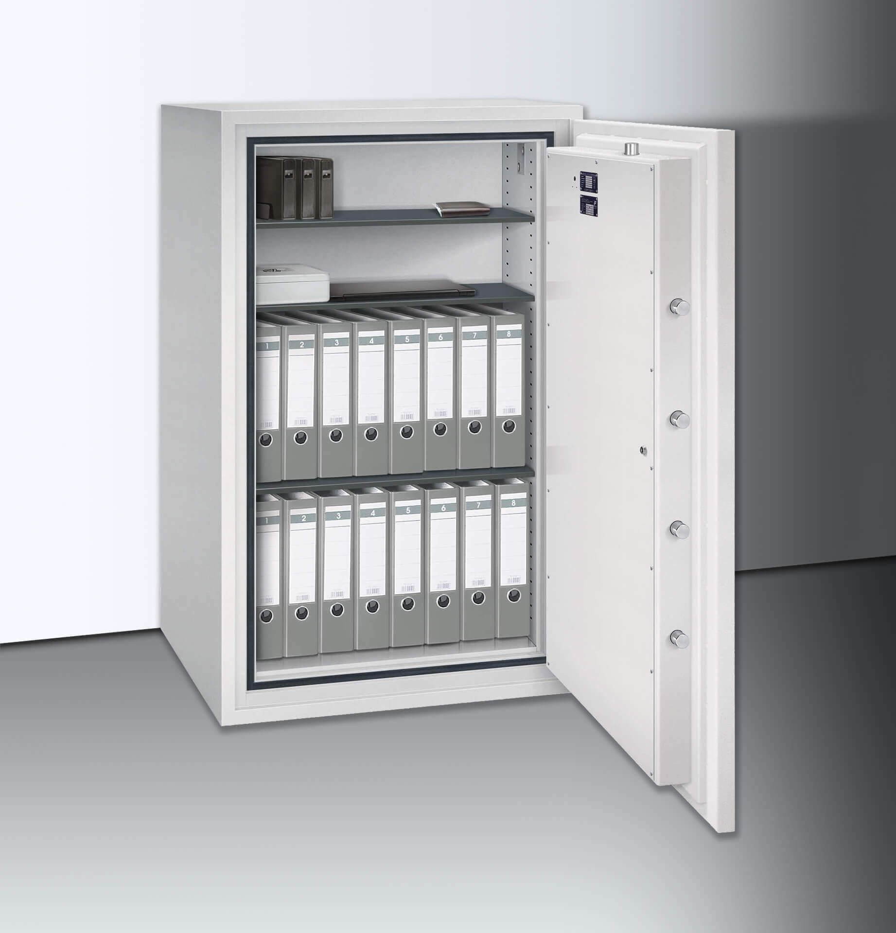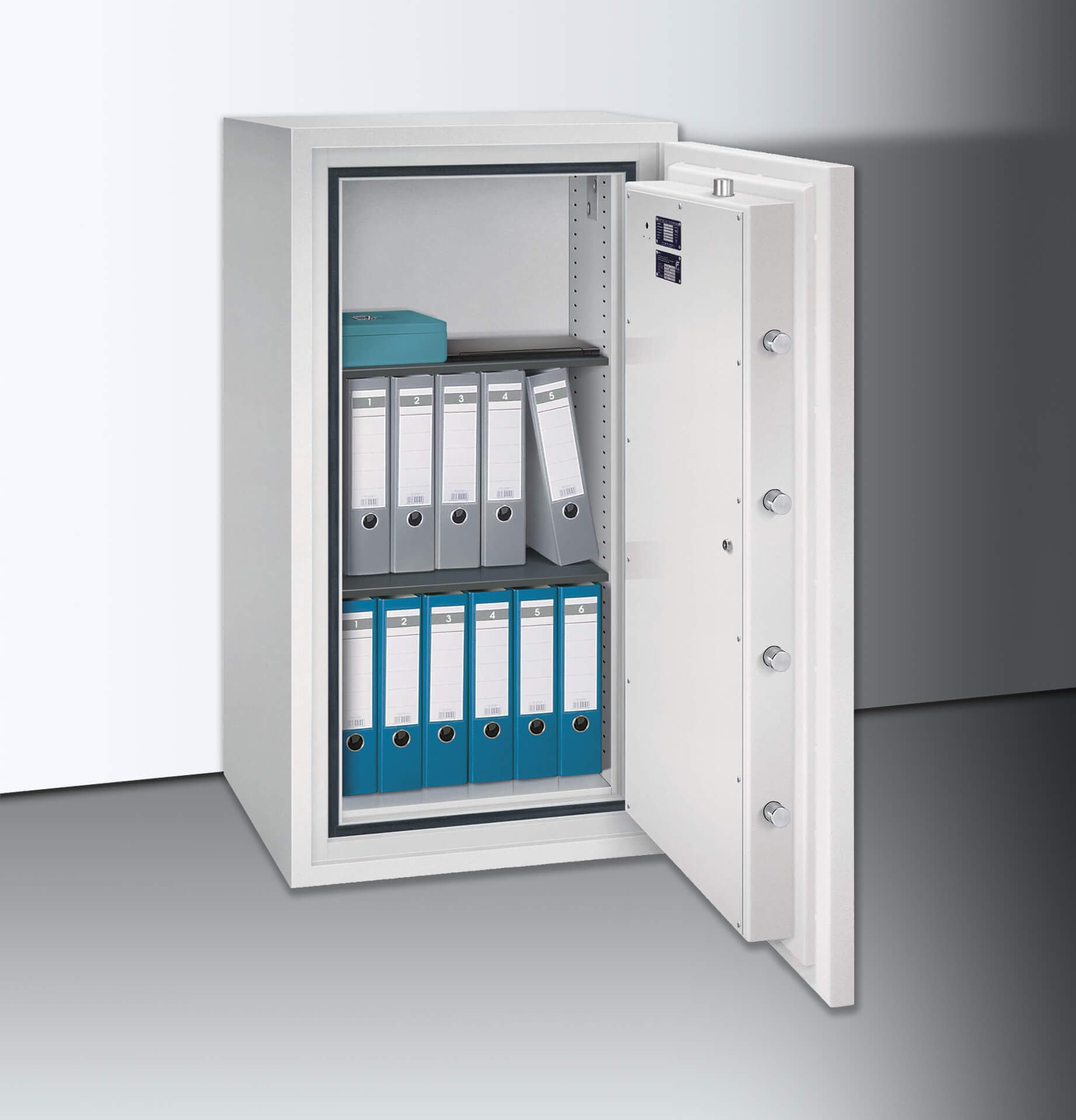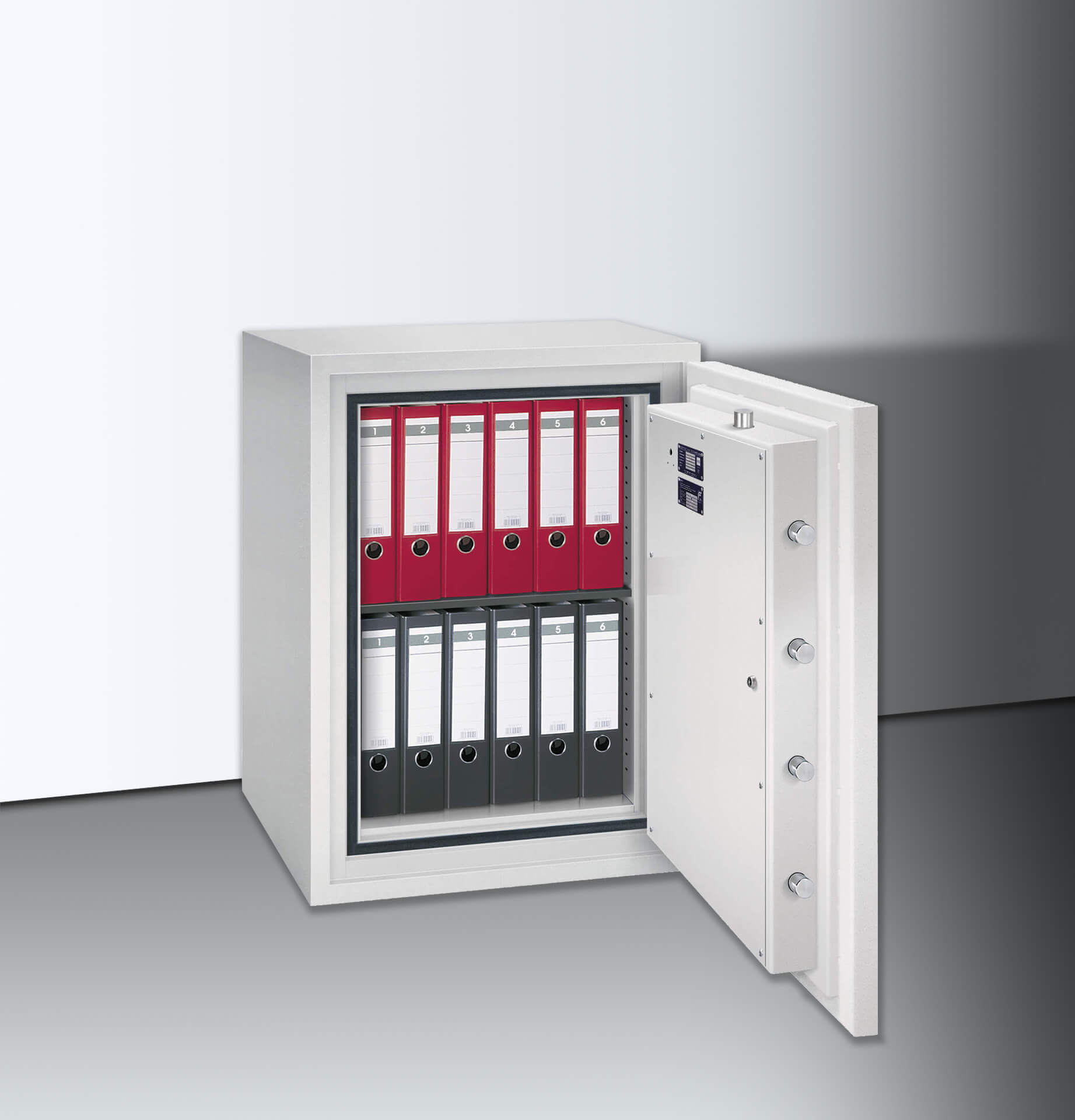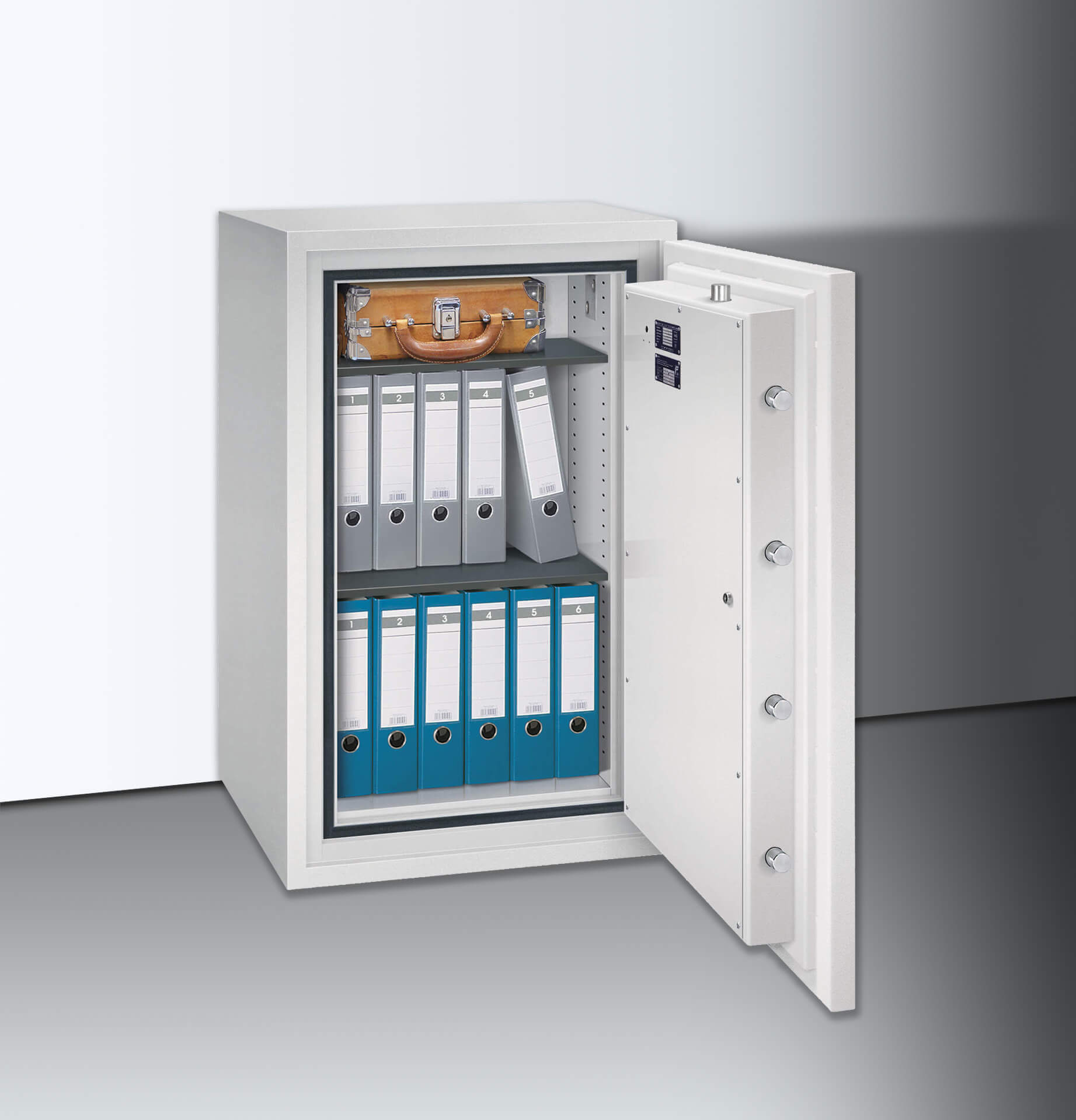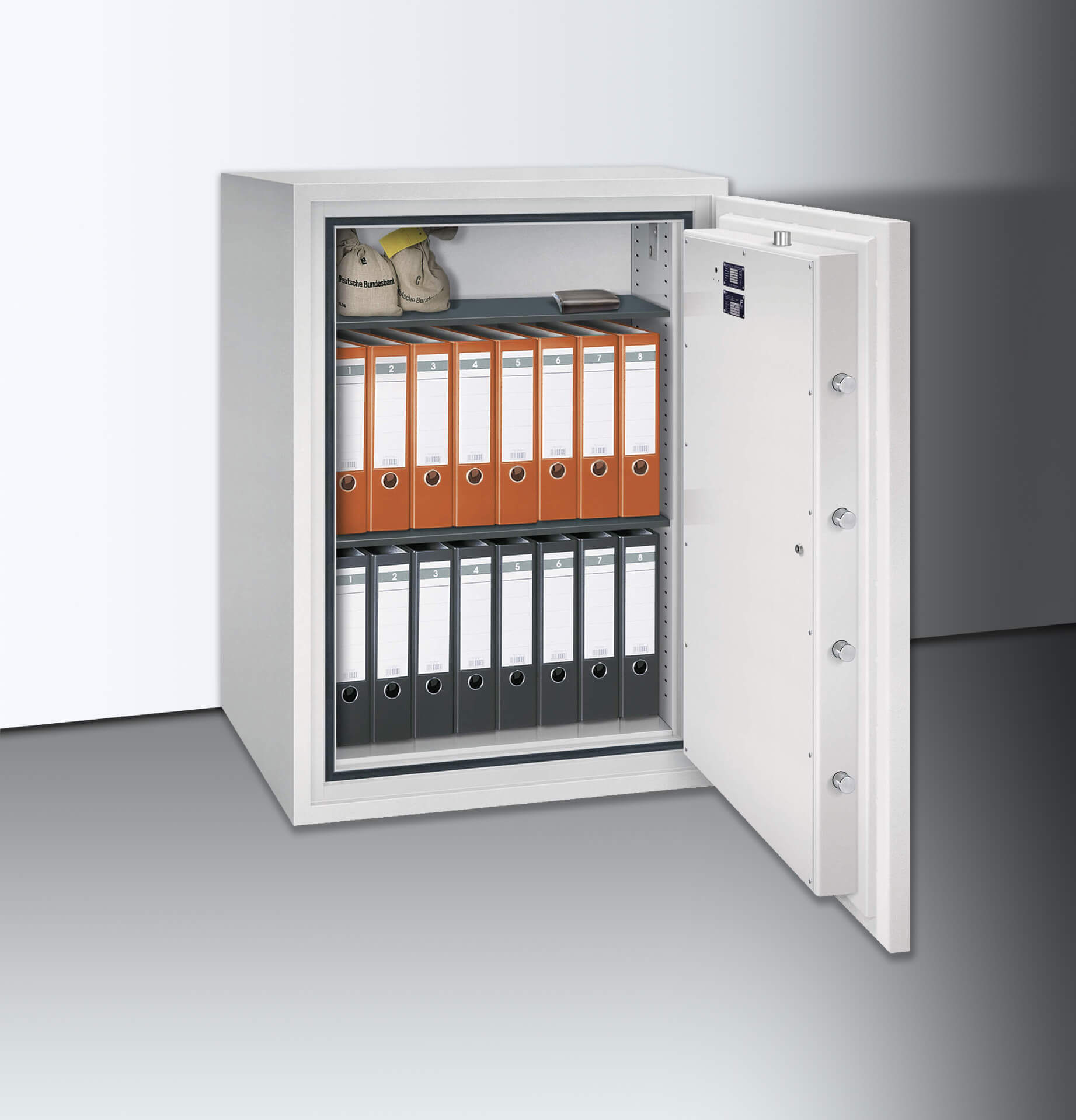 Hohe Sicherheit: Die S-V-Serie ist ein hervorragender Schutz für hohe Werte. Der dreiwandige Tresoraufbau, gefüllt mit Spezialbeton, dem auch Diamantkronenbohrer nichts entgegenzusetzen haben, hat eine zusätzliche Panzerung gegen Schweiß- und Schneidbrennerangriffe im Verschlussbereich. Der Übergang von der Tür zum Korpus bilden sechs 40 mm starke Riegelbolzen aus Stahl, massive Hintergreiferbolzen verhindern ein Aufhebeln der Tür auch bei durchtrennten Scharnierbändern. Sicherungen gegen Aufbohren an allen Sperrpunkten und ein Notverriegelungsmechanismus sichern den Inhalt zusätzlich ab. Die Wertschutzschränke dieser Klasse verfügen über zwei Doppelbartsicherheitsschlösser, welche natürlich durch eine unserer vielen Varianten optional ersetzt werden kann. Um die Sicherheit zu erhöhen, können Sie die installierten Vorbereitungen für eine externe Überwachung und Einbruchmeldeanlage sowie die Bodenverankerung (bis 1000 kg) nutzen.